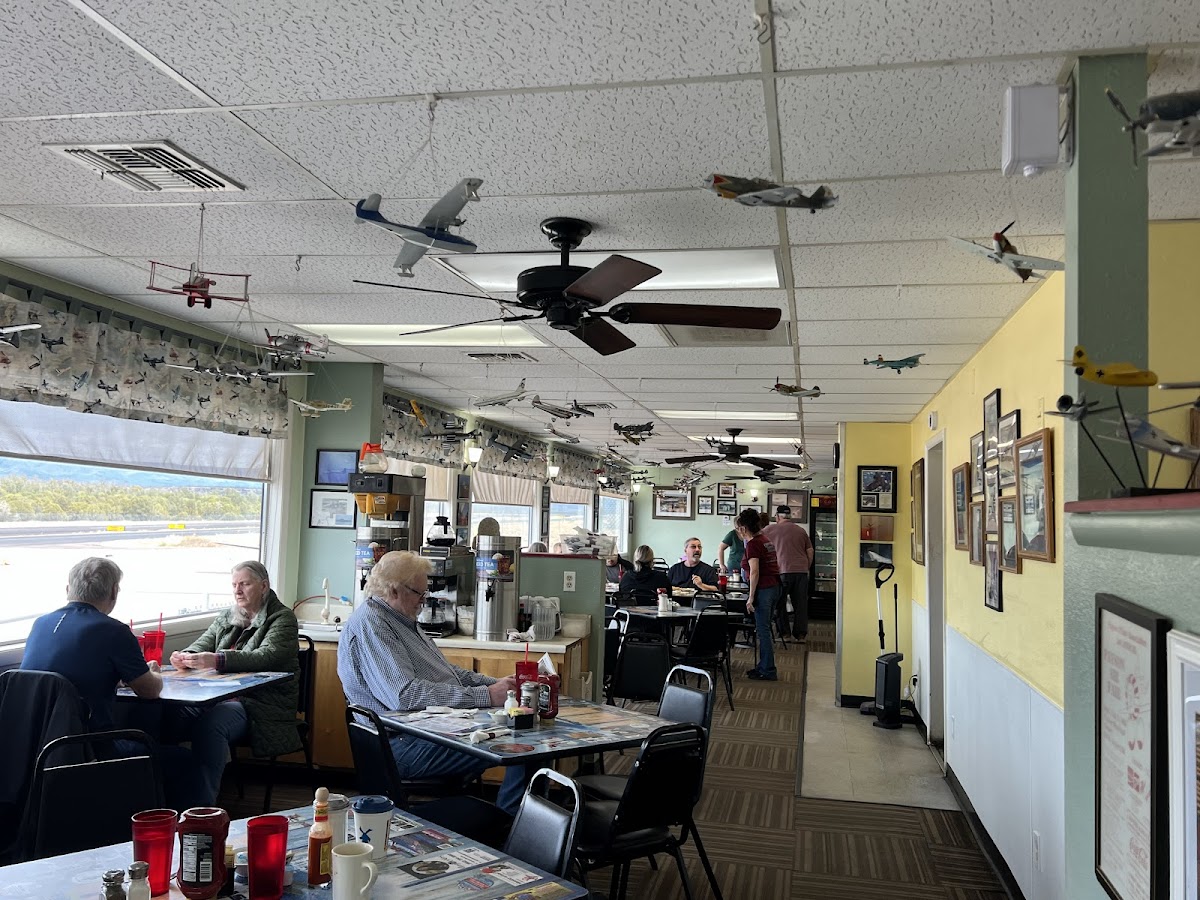 Their menu is fantastic! Tons of sandwiches, BREAKFAST ALL DAY, burgers and pies. You can see planes take off and landing while eating. Tons of parking and everyone is very kind.